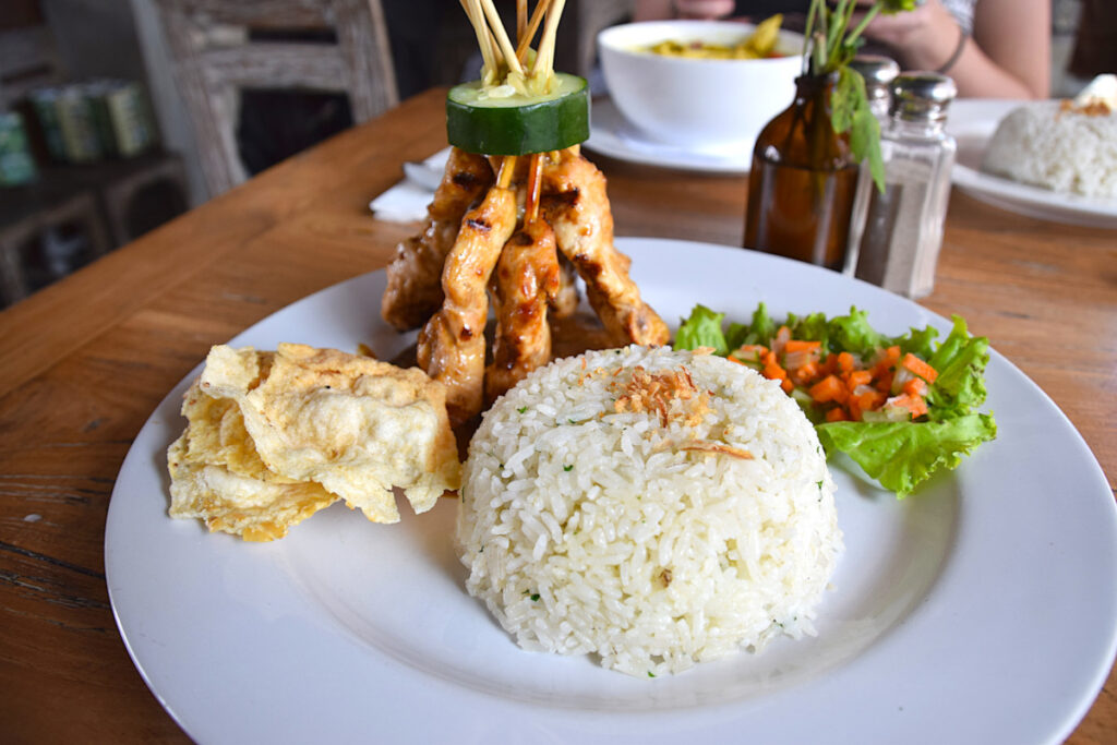 We perused some stalls somewhere around Tanah Lot, all peddling souvenirs, snacks, or refreshments. We got some drinks at a stall on the way back to the car, and then drove to Kuta. We had lunch at a restaurant near the beach. I had chicken satay (chicken skewers usually paired with a peanut sauce), which came with rice and prawn crackers. It’s one of my favorite things to eat in Southeast Asia.