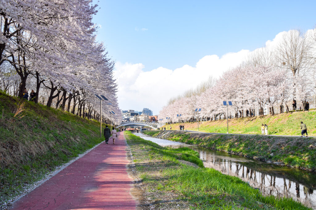 Because this spot is a little further away from the center of the city, it’s not quite as popular as other spots for cherry blossoms on this list. But it is absolutely beautiful, which definitely makes it one of the best places to see cherry blossoms in Seoul.