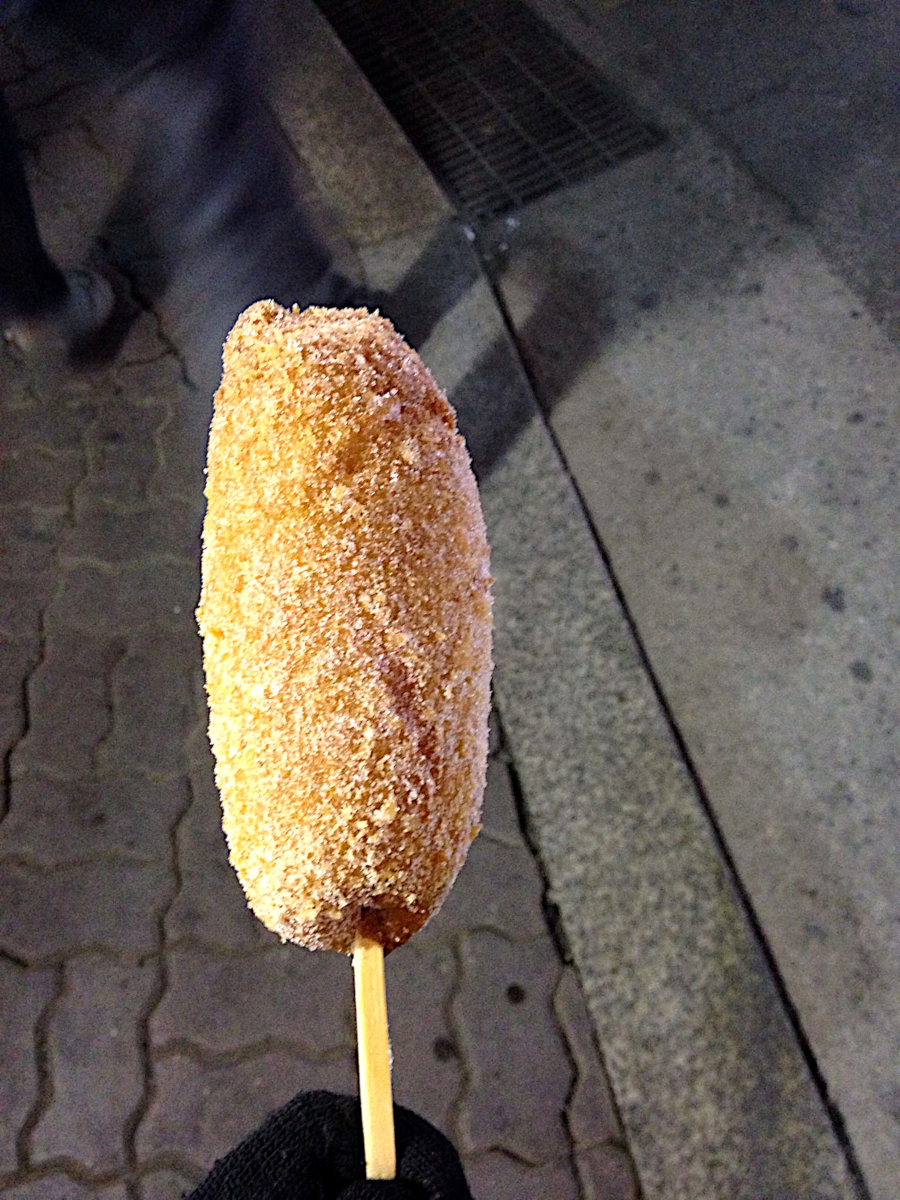 A few popular Korean street foods: chicken skewer, hot dog, and tornado potato